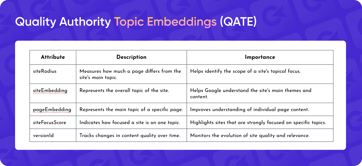 I organized the information in a table to break down what these parts of the Quality Authority Topic Embeddings (QATE) mean. For example, "page embedding" refers to the main topic of a specific page, while "site embedding" relates to the overarching topic of the entire website. With this functionality, Google could identify both the main topic of a page and the broader topic of the site. Through the "site radius" feature, it could even compare whether a page’s topic aligns with or differs from the overall website theme.