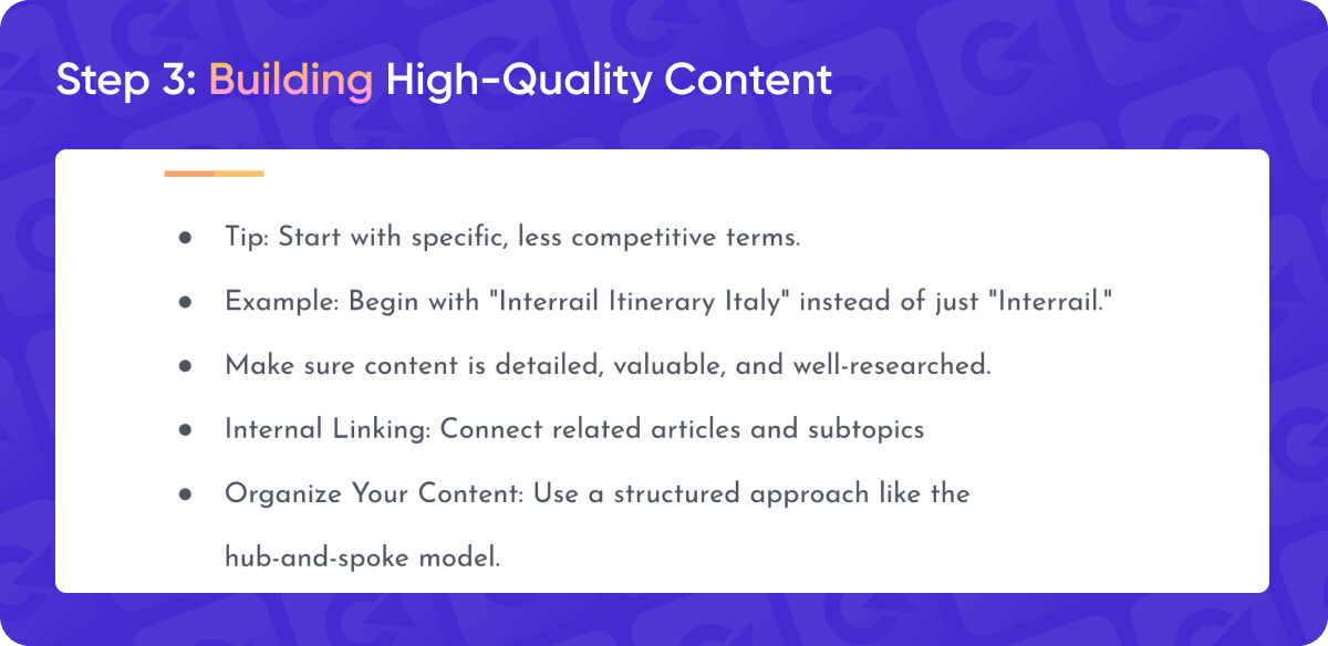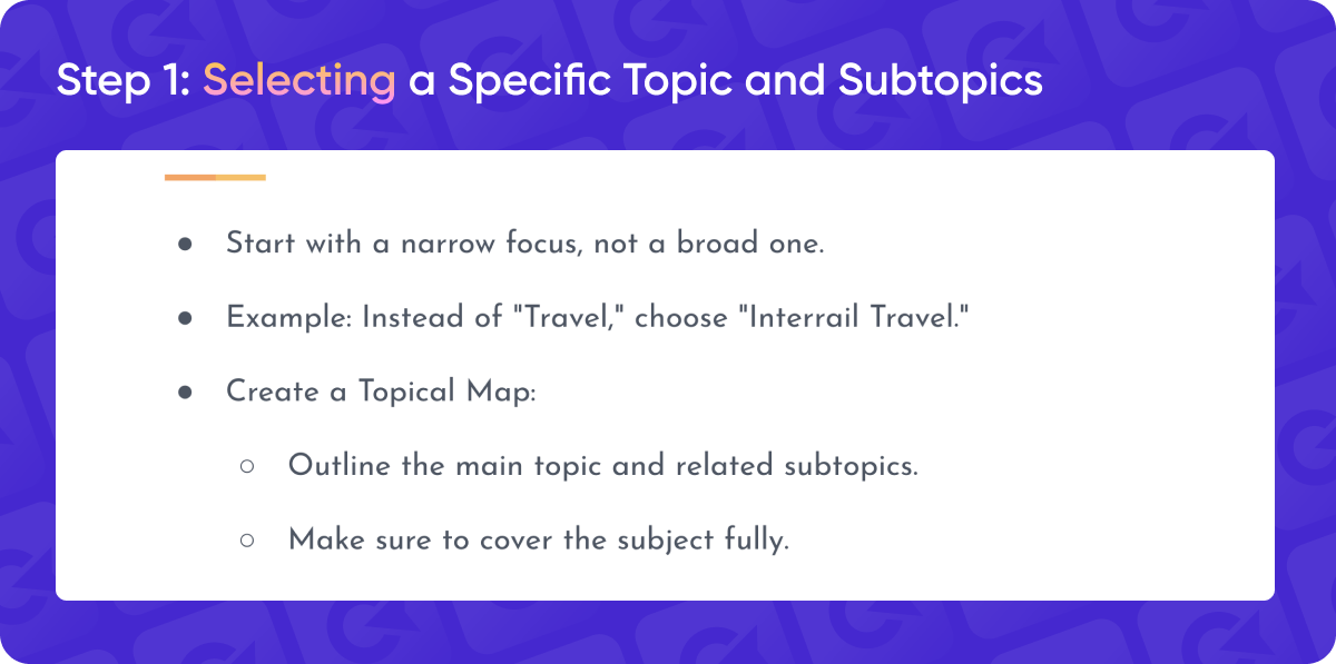 [DL]: The first step is to really narrow down your topic. I know it may sound strange to say “choose a topic” because you already have a brand and products or services you're focused on. But what I mean is to pick a specific subtopic. For example, if you run a travel blog, the general topic of travel is huge — you can’t build topical authority for “travel” as a whole. Instead, you could focus on a niche like “traveling in Portugal” or “Interrailing.” It needs to be a focused subtopic.