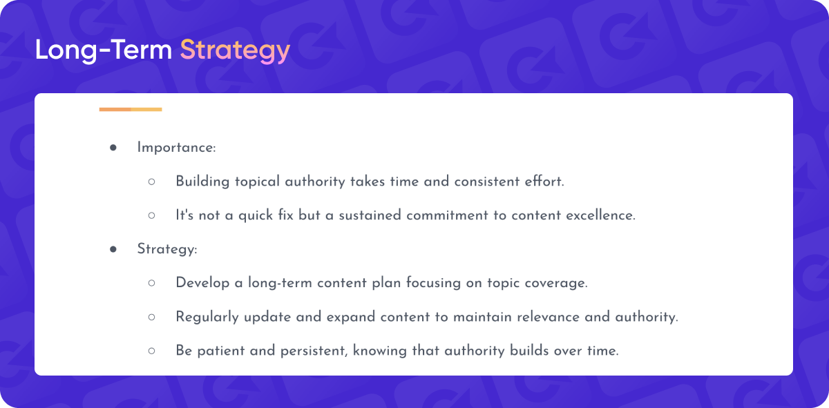 [DL]: Another crucial aspect of topical authority is that it’s a long-term strategy. While SEO in general should be a long-term approach, if your plan centers on building topical authority, be prepared for slow progress at the beginning. You’ll need to reach a critical mass of content before you start seeing results, so initially, you’ll just keep writing and publishing without immediate impact.
