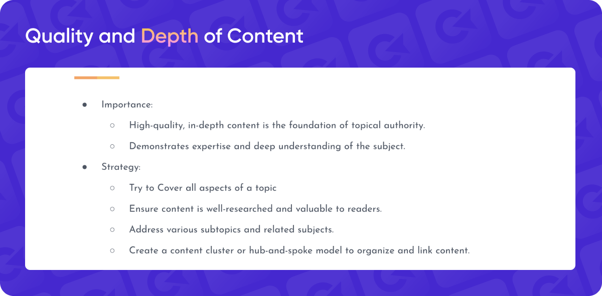 - In-Depth Topic Coverage: To establish topical authority, you need to go deep and create thorough, comprehensive content. This way, you’re not only meeting user needs but also signaling to search engines that your site is a reliable source on the topic.