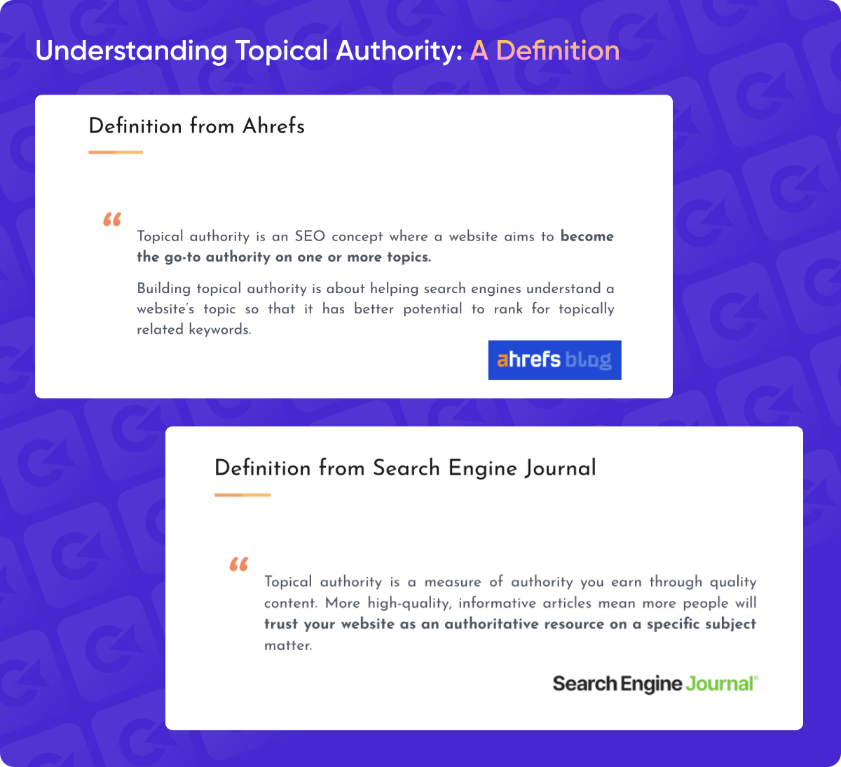 Then, Search Engine Journal suggests that building authority means becoming the authoritative resource on a specific subject, which aligns more closely with my own understanding of topical authority. Ahrefs defines it as becoming the go-to authority on one or more topics. And Neil Patel puts it very simply: your website should be the place to learn about a particular subject.
