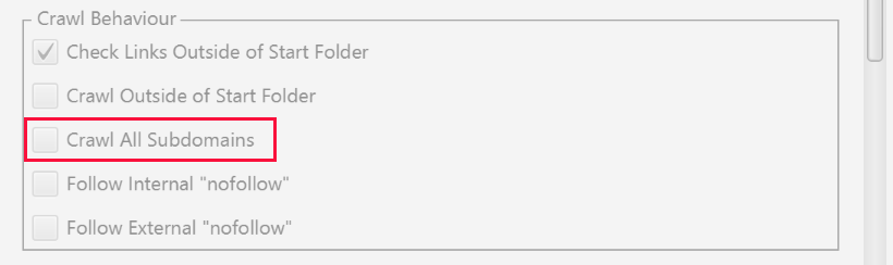 Если вы начали сканирование с конкретной вложенной папки и все еще хотите, чтобы Screaming Frog проверил весь сайт, отметьте «Crawl Outside of Start Folder».