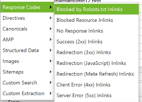 Вы можете просмотреть и массово экспортировать любые заблокированные ресурсы, которые могут повлиять на сканирование и рендеринг вашего сайта, перейдя в Bulk Export > Response Codes.