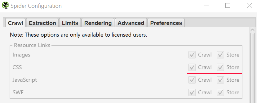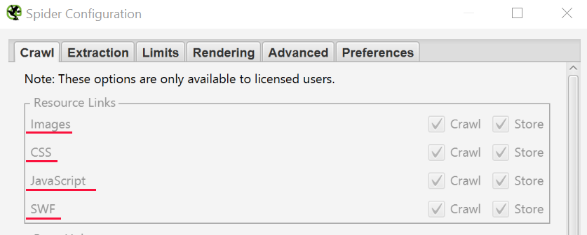 Чтобы в Screaming Frog отключить сканирование изображений, CSS и Javascript файлов, снимите галочки с ненужных элементов. Это позволит сохранить время и место на диске (уменьшить размер сканируемых файлов).