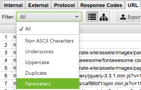 Чтобы определить URLы с идентификаторами сеанса или другими параметрами, просто проведите сканирование вашего сайта с настройками по умолчанию. По завершению проверки перейдите во вкладку «URL» и отсортируйте по «Parameters», чтобы посмотреть все ссылки с параметрами.