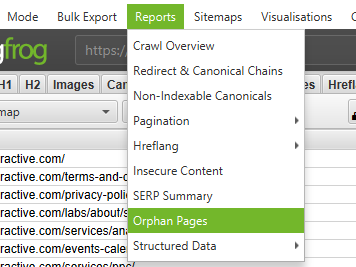 - посмотрите сиротские URLы в каждой вкладке или сделайте массовый экспорт URLов, перейдя в Reports > Orphan Pages.