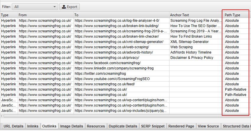 Screaming Frog позволяет узнать тип пути ссылки (абсолютный, относительный, протокольный или корневой). Его можно увидеть в ссылках, исходящих ссылках и во всех массовых экспортах.