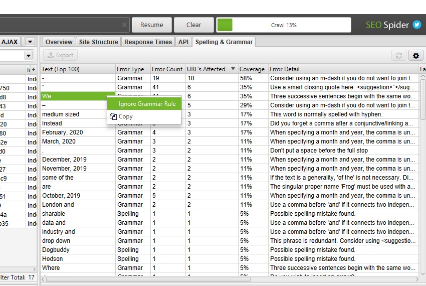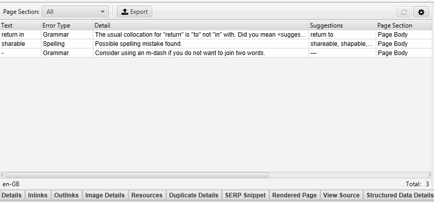 На вкладке «Spelling & Grammar» на правой панели отображаются 100 обнаруженных уникальных ошибок и количество URL-адресов, на которые они влияют. Это может быть полезно для поиска ошибок в шаблонах, а также для построения вашего словаря или списка игнорируемых слов.