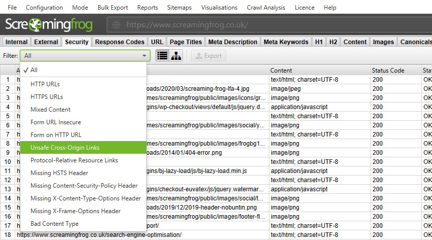 Несмотря на то, что SEO Spider уже смог идентифицировать HTTP-URL, смешанный контент и другие небезопасные элементы, отображение в фильтрах помогает легче их обнаружить.
