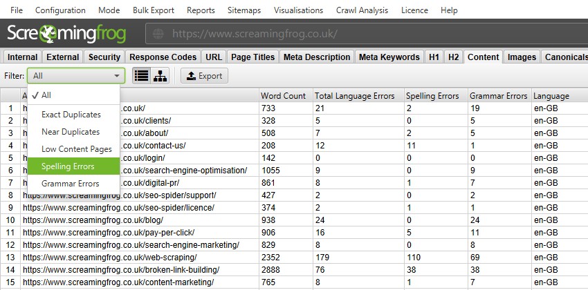 Как проверить орфографию и грамматику при помощи Screaming Frog? Новая вкладка «Content» содержит фильтры для «Spelling Errors» и «Grammar Errors» и отображает счетчики для каждой просканированной страницы.
