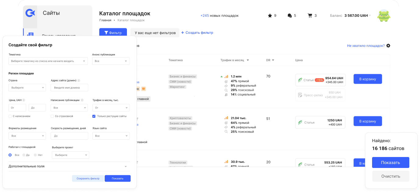 В настройках фильтров дополнительно можно выбрать площадки с растущим трафиком